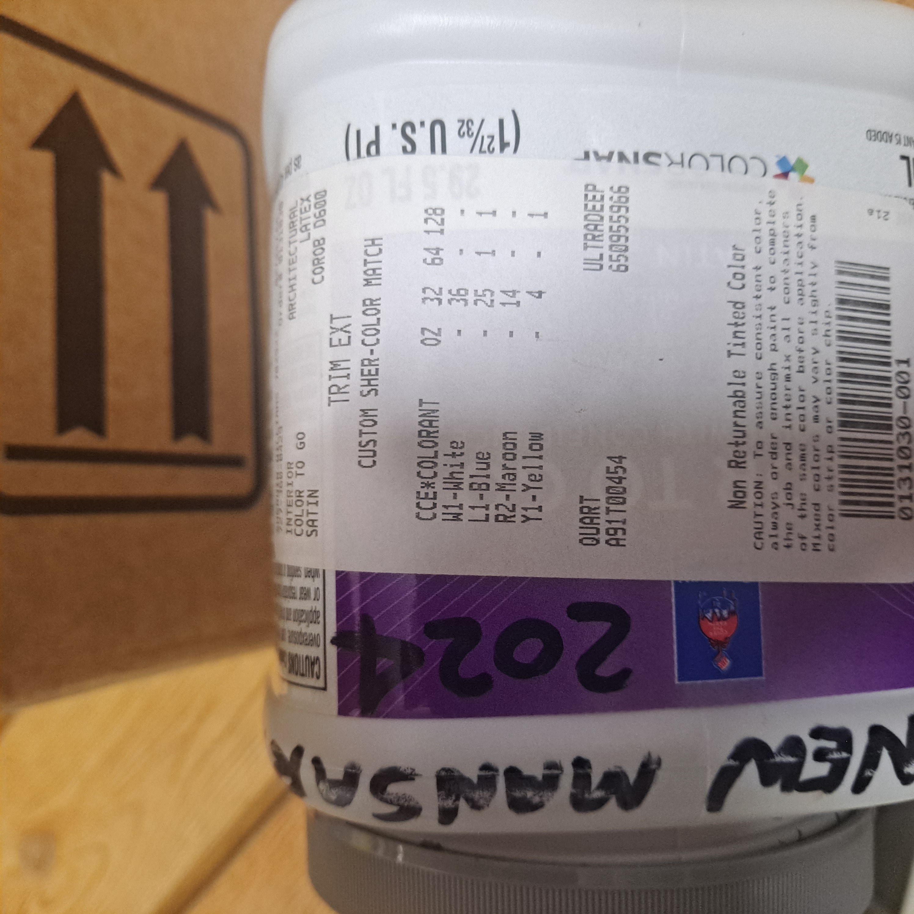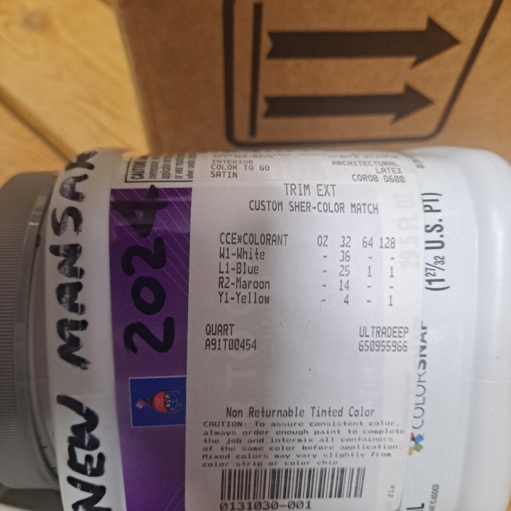 This is the label on paint that was color-matched to the Musket Gray mansard by the Sherwin-Williams store location on Pasadena Blvd.